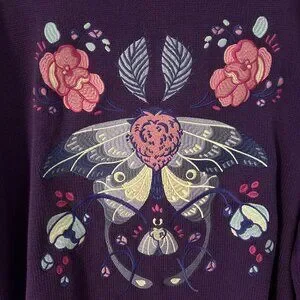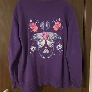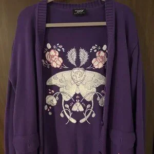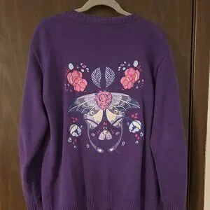 100% Cotton Cardigan from Morningwitch featuring the Twilight Moth design. No longer sold. Back and pockets are embroidered. Unisex small. Oversized fit.