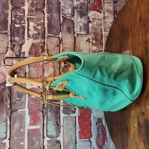 Pretty jade green (almost a turquoise color) canvas with circular shaped tan leather/wood top handles and tan leather trim.