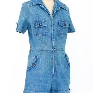Keywords: Distressed medium wash zip front denim romper 1970s 70s vintage
