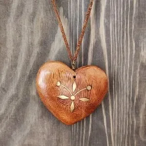 Vintage Large Wooden Heart With Brass Inlay Pendant Necklace