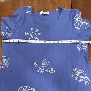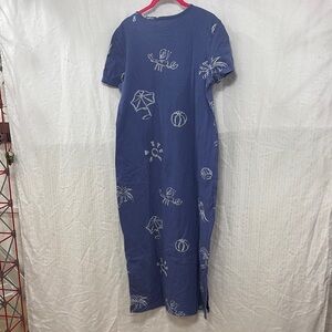Blue vintage 1990s Casual Corner knit stretch short sleeved printed maxi dress. The print is beach themed with the sun, umbrellas, crabs, lobster, palm trees, and volleyballs all over. Super cute for a vacation!