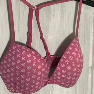 Stylish pink bra with peace sign design. Comfortable and trendy. Ideal for daily wear.