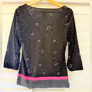 Stylish gray top with floral pattern. Features pink accent stripe. Three-quarter sleeves. Perfect for casual wear.
