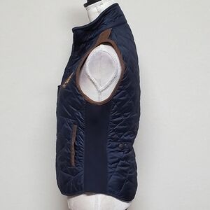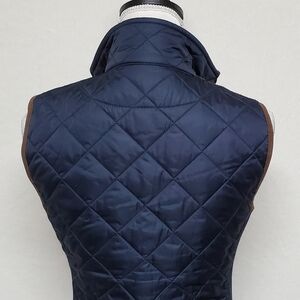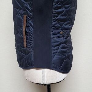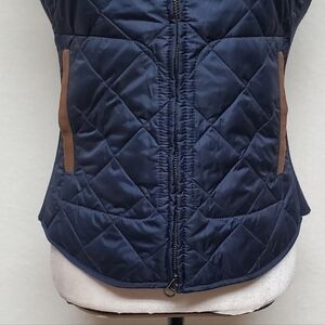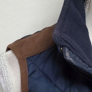 Navy blue quilted and insulated with brown faux suede shoulders and trim.