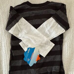 Fun kids Halloween t-shirt featuring Paw Patrol characters. Black and gray striped design with colorful graphics.