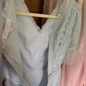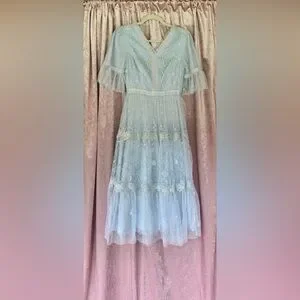 This dress is a dreamy, feminine piece that exudes elegance and charm. Crafted in a soft, powdery blue, it features delicate lace embroidery and airy layers of sheer tulle that give it a romantic, ethereal quality. The V-neckline is flattering yet modest, while the semi-sheer puff sleeves add a touch of vintage grace. A fitted waistline creates a flattering silhouette before flowing into a tiered, tea-length skirt that moves beautifully with every step. Perfect for weddings, garden parties, or special occasions, this dress is a timeless blend of sophistication and fairytale-like beauty.