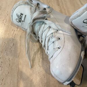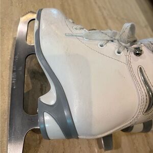 White and silver previously owned figure skates. Mark 1, Soft Skate by JACKSON. Top lace hook on one skate is missing. May not be needed to give room for foot movement. Scuffs, scratches on blades (would want to have sharpened) and discoloration on top inside padding from use. See photos. Size 12J (12 Junior), Blade 7 1/3