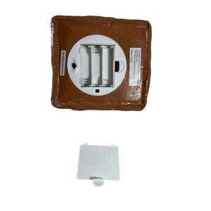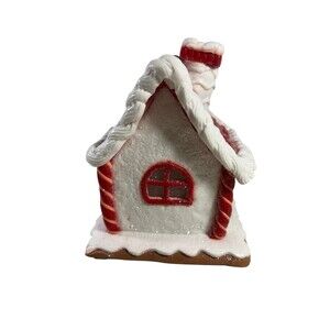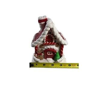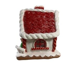 For sale is a charming preowned battery-operated gingerbread house that lights up, perfect for holiday decor! This delightful piece features a detailed design with a gingerbread figure, candy accents, and a snowy finish. It includes an on/off switch on the bottom and requires 3 AA batteries (not included). Tested and works great, with no chips or cracks.