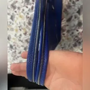 Missing inside zipper pull pocket and really small areas inside have pen marks. No tear, no rips no faded color. Looks like new beside those small issues mentioned above and pictured as well.