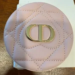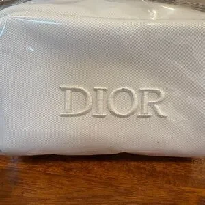 Chic Dior set includes a white cosmetic bag, full size lipstick, blush, perfume sample, and pink leather cosmetic compact mirror.