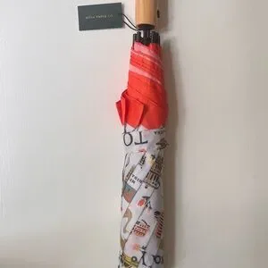 Stylish umbrella with city illustrations. Features vibrant colors and travel motifs. Perfect for rainy days.