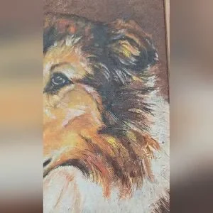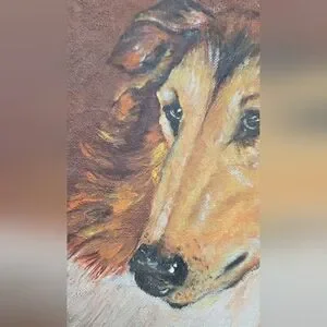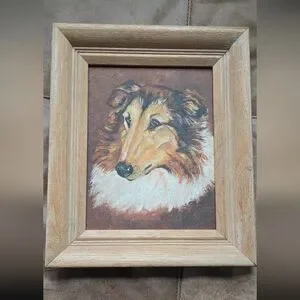 Beautiful framed portrait of a Collie dog. Features warm brown and cream tones. Perfect for dog lovers, or someone who enjoys the breed. Would look fantastic on a gallery wall