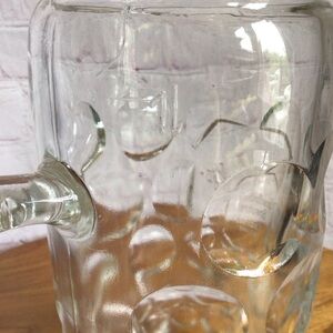 Enhance your dining table with this Vintage Dimpled Glass Mug, featuring a classic design that combines elegance and functionality. Its sturdy handle offers a comfortable grip, making it ideal for savoring your favorite drinks. This timeless piece is perfect for any occasion, adding a touch of sophistication to your setting. This heavy glass stein reads, Gesellschafts - Brauerei Viechtach Seit 1553. Brewery was established in 1553. Made in Germany. This 1 liter (approximately 34oz) mug measures approximately 8” tall, 6 1/2” wide including the handle. This mug weighs around 3lbs empty and a whopping 5lbs when full! Wow! Good vintage condition. No cracks or repairs. There are some small chips in the glass as shown. Smoke free home.