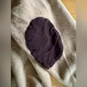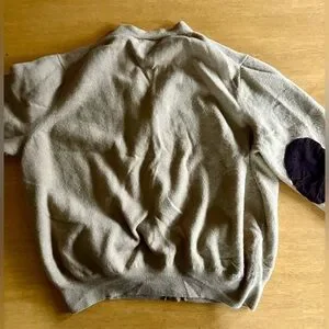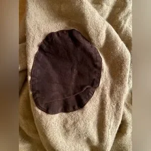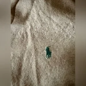 Tan / beige merino wool v neck cardigan, button up with chocolate brown elbow pads. 100% merino wool - very soft like cashmere. Green embroidered pony. Two front pockets. Size tag removed, fits like a medium or large