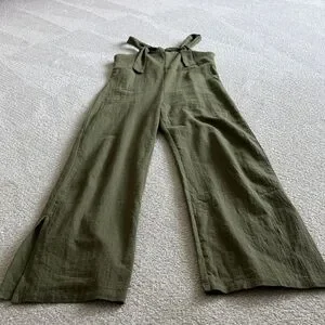 Chic army green jumpsuit with tie straps. Flattering wide-leg design. Ideal for versatile styling.