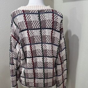 Stay cozy and stylish with this plaid knit sweater. Featuring a classic cream base with red and blue accents, this sweater is perfect for any casual outing. Its soft fabric ensures comfort all day long.