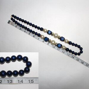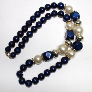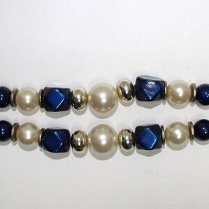 Blue, Silver Bead & Imitation Pearl 30" Long Resin Spring Ring Clasp Necklace