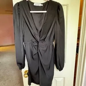 This adorable satin little black dress features long sleeves and a twist front and elastic waist