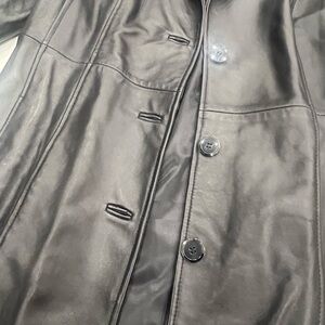 Sophisticated black leather trench coat. Timeless design with button closure. Ideal for stylish outings.