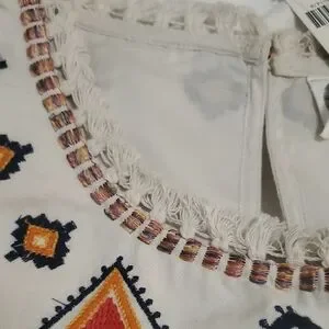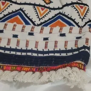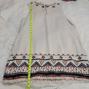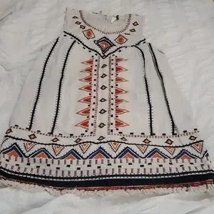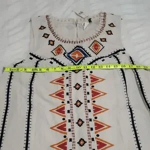 Chic, NWT midi dress with vibrant geometric embroidery & fringed hem.