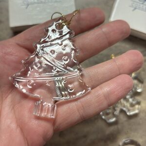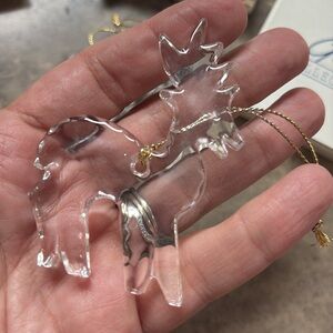 Elegant crystal ornaments featuring a tree, snowflake, and reindeer. Perfect for festive decor.