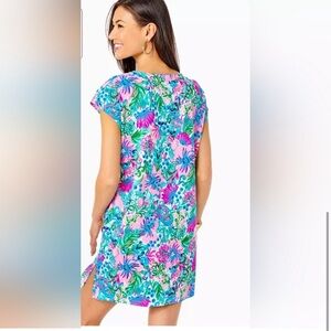 Inspired by our favorite tee, the Tally V-Neck Dress/Cover-up features the same easy-fit design you know and love. Fashioned in a t-shirt silhouette, it features short sleeves and an eye catching Lilly print. Perfect all-in-one style for your day poolside or running around town. This Luxletic look is made from Meryl Nylon, which provides comfort and range of motion while offering a high-performance combination of moisture management and UPF 50+