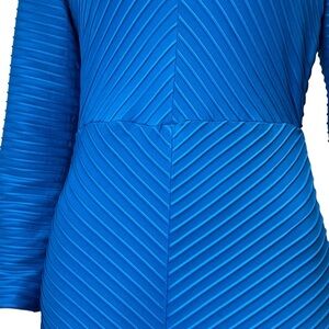 NEW!!! Blending exquisitely designed, unique, meticulously crafted clothing with elegance and comfort, this Heydari dress does not disappoint. Crafted in a light weight soft gorgeous blue stretch textured knit featuring a unique play of multi directional textured stripes, cowl neck, side seam pockets, pull-over styling and an easy shaped fit that flows into a lantern shaped hem. So chic, so avant-garde, so unique.