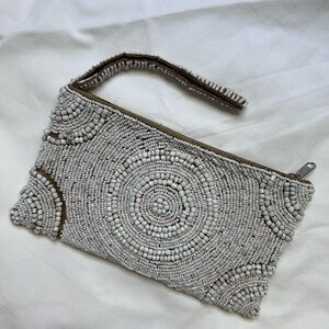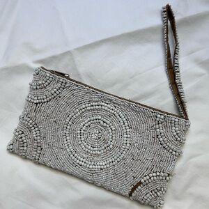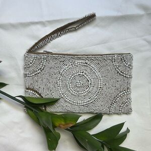 Chic wristlet with intricate white bead design. Perfect for adding elegance to any outfit.