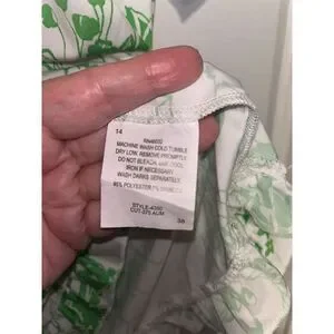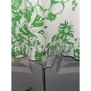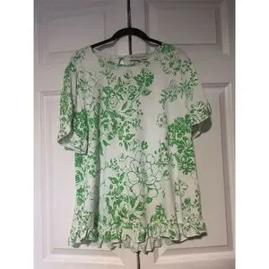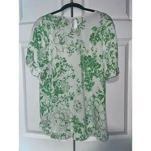 This Southern Lady shirt in size L features a short-sleeve design with ruffled hem and sleeves. The green floral pattern adds a touch of elegance, making it suitable for casual occasions. Made from a blend of polyester and spandex, it is machine washable for easy care. Manufactured in Bangladesh, this shirt is pre-owned.