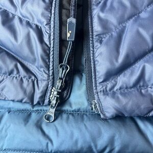 Excellent condition! Lightweight and super warm. The zipper does close but looks funny at the bottom. As shown in photos! 35 inches in length