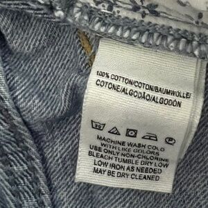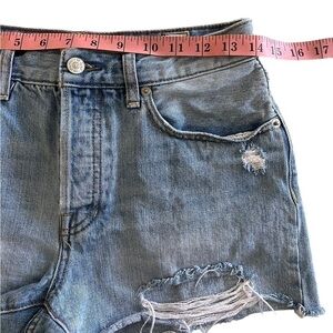 We The Free Juniors Distressed Button Fly Jean Shorts. Size 27. Light blue wash denim with distressing and rips. Frayed raw hems. Classic 5 pocket design. Approximate measurements as pictured. 100% cotton. Machine washable. Good used condition.