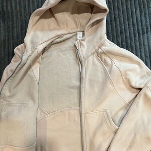 Cozy cream full zip Scuba with front pockets and hood. Features Lululemon logo. Has emergency hair tie, size M/L