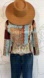 Vibrant patchwork smocked top with 3/4 sleeves. Features small metallic sequins on front among a mix of blue, brown, and cream tones.