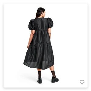 Chic black midi dress with dramatic puff sleeves. Ideal for stylish outings.