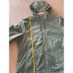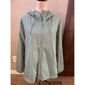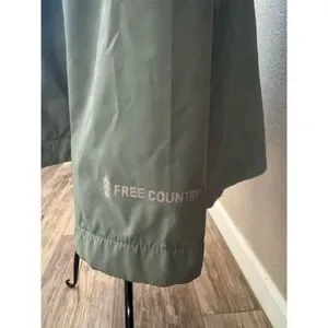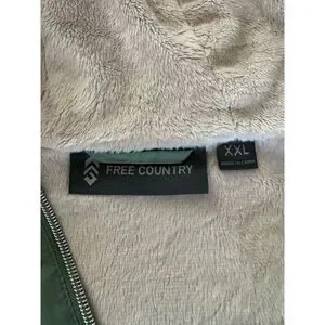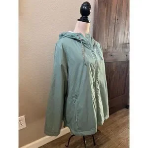 Keywords: Free Country jacket, women's windbreaker, 2XL green jacket, polyester outer shell, faux fur lining, casual fall jacket, mid-length coat, long sleeve windbreaker, zip closure jacket, attached hood, pre-owned jacket, soft lining, two front zippered pockets, regular fit jacket, women's casual wear