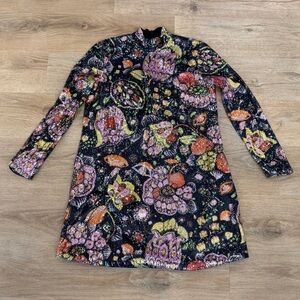 Shift. Long sleeves. Mock neck. Back zipper closure. Approximately 33.5" from shoulder to hemline. Made in Italy.