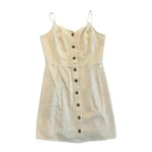 Elevate your summer wardrobe with this SHE + SKY “Arrie” Dress in size Medium. This stylish mini dress features a flattering button-down front, adjustable spaghetti straps, and a fitted bodice that flows into a subtle A-line silhouette. Crafted in a soft beige fabric with a denim-like texture, it’s perfect for brunch dates, vacations, or casual outings.