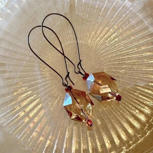 The beads are high quality faceted glass in light topaz and deep red colors. The kidney wire earring fixtures are nickel free with a burnished brass colored finish.