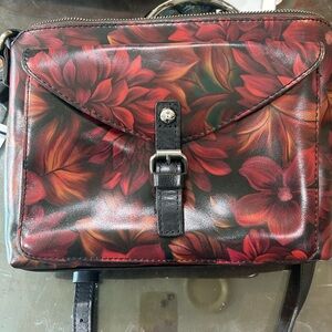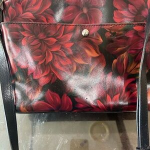 Stylish floral leather crossbody bag with a vibrant red and black design. Perfect for any occasion. 11x8x4. In very new condition!