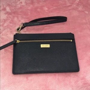 Elegant Navy Blue Kate Spade leather wristlet clutch wallet with gold accents and two zipper compartments. Perfect for a night out or casual day use. Wristlet can be attached to other things to secure to inside your purse of backpack.