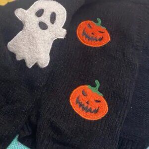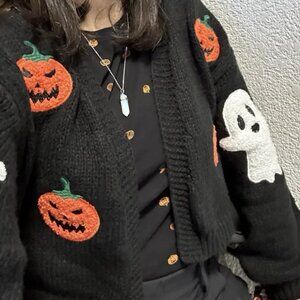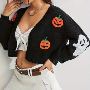 new Halloween knitted open front crop top cardigan jacket with pumpkins and ghost patches, loose fit, 100% Acrylic