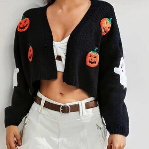 Halloween Knitted Open Front Crop Top Cardigan Jacket Sweater Ghost Pumpkin