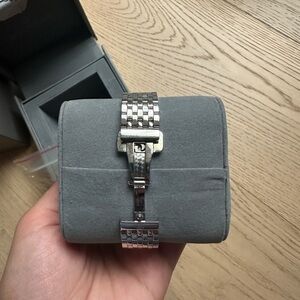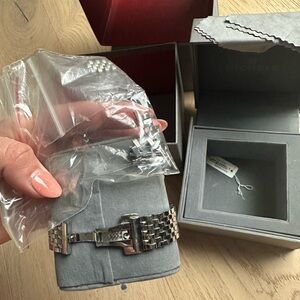 Sophisticated Michele watch with silver tones. Features Roman numeral dial. Perfect for timeless elegance.