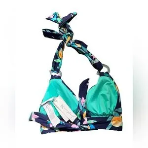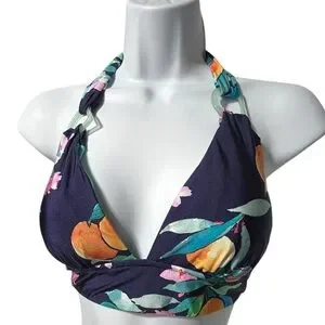 SUNSHINE 79 navy floral banded peaches halter style triangle bikini swim top, size 6.