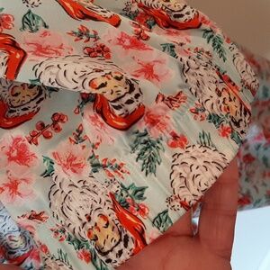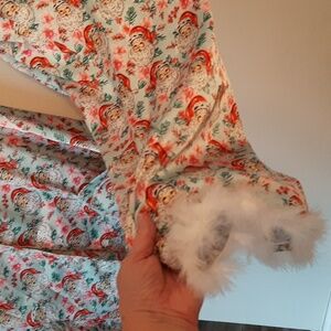 Vintage Santa pattern , SO cute! New w tags. Size XL. Fur on the bottom of sleeves & pants. Elastic waisted pants, buttons up V neck, long sleeves but a light, comfy fabric. Top has pockets on front bottom. Non smoking home.