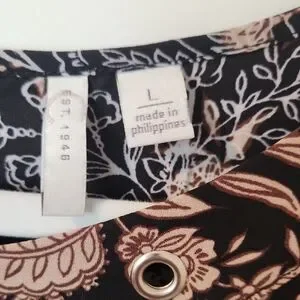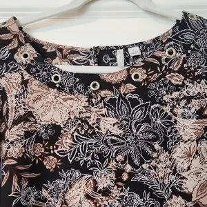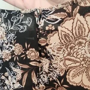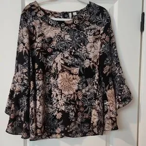 Chic Floral Women's Blouse in Black and Cream With Bell Sleeves Size Large