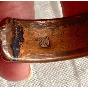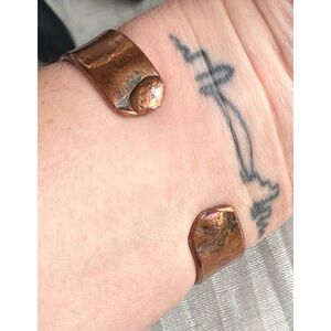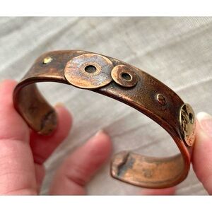 Funky artisan cuff bracelet with abstract disk-shaped appliqués. Appears to be made of copper and brass. Heavily oxidized finish which makes the accent pieces pop. Stamp and style suggest Ildanach Studios, which specializes in hand-forged recycled copper jewelry.
