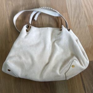 House of Harlow 1960 Vegan Suede Shoulder Bag. Cream in color, brass toned hardware, dual shoulder straps, single zipper interior pocket, additional wristlet/coin purse. Very light wear on bottom as pictured. Interior is nearly perfect. Snap closure. One of these sold on The RealReal for $103.50.