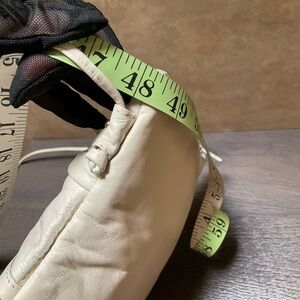 Please see photos for dimensions. No indication if first purse is leather. Note imperfections in pics. Bead bag interior inside wall “cardboard” loose, just tuck in.