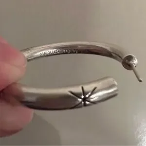 The vintage Taxco sterling silver earrings display a polished finish with a unique star-like engraved pattern. They offer a sleek and elegant appearance, ideal for any vintage jewelry collection.